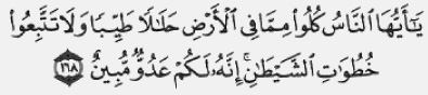 O gens! De ce qui existe sur la terre; mangez le licite et le pur; ne suivez point les pas du Diable car il est vraiment pour vous, un ennemi déclaré.