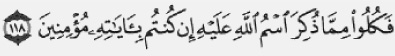 Mangez donc de ce sur quoi on a prononcé le nom d'Allah si vous êtes croyants en Ses versets (le Coran).