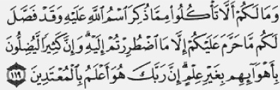 Qu'avez-vous à ne pas manger de ce sur quoi le nom d'Allah a été prononcé? Alors qu'Il vous a détaillé ce qu'Il vous a interdit, à moins que vous ne soyez contraints d'y recourir. Beaucoup de gens égarent, sans savoir, par leurs passions. C'est ton Seigneur qui connaît le mieux les transgresseurs.