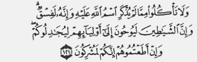 Et ne mangez pas de ce sur quoi le nom d'Allah n'a pas été prononcé, car ce serait (assurément) une perversité. Les diables inspirent à leurs alliés de disputer avec vous. Si vous leur obéissez, vous deviendrez certes des associateurs.