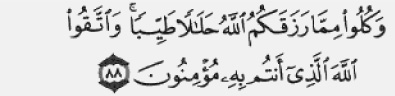 Et mangez de ce qu'Allah vous a attribué de licite et de bon. Craignez Allah, en qui vous avez foi.