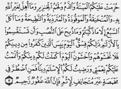Vous sont interdits la bête trouvée morte, le sang, la chair de porc, ce sur quoi on a invoqué un autre nom que celui d'Allah, la bête étouffée, la bête assommée ou morte d'une chute ou morte d'un coup de corne, et celle qu'une bête féroce a dévorée - sauf celle que vous égorgez avant qu'elle ne soit morte -. (Vous sont interdits aussi la bête) qu'on a immolée sur les pierres dressées, ainsi que de procéder au partage par tirage au sort au moyen de flèches. Car cela est perversité. Aujourd'hui, les mécréants désespèrent (de vous détourner) de votre religion: ne les craignez donc pas et craignez-Moi. Aujourd'hui, J'ai parachevé pour vous votre religion, et accompli sur vous Mon bienfait. Et J'agrée l'Islam comme religion pour vous. Si quelqu'un est contraint par la faim, sans inclination vers le péché... alors, Allah est Pardonneur et Miséricordieux.